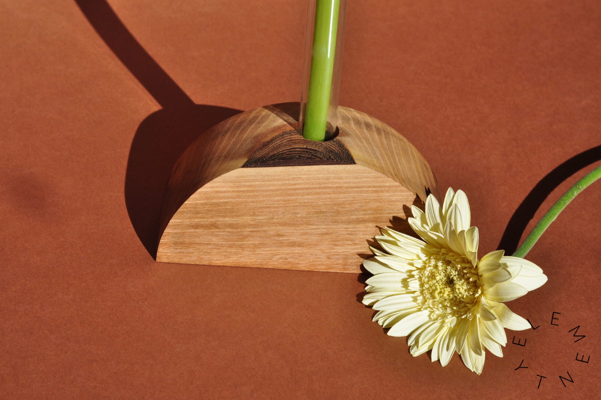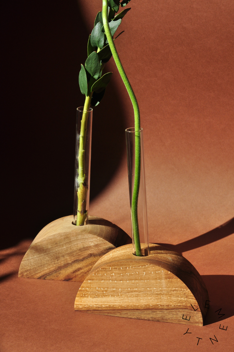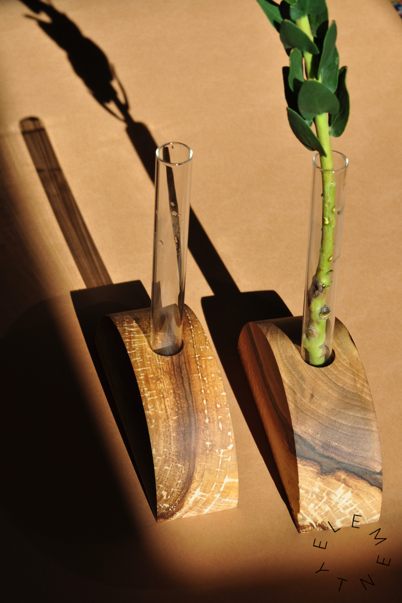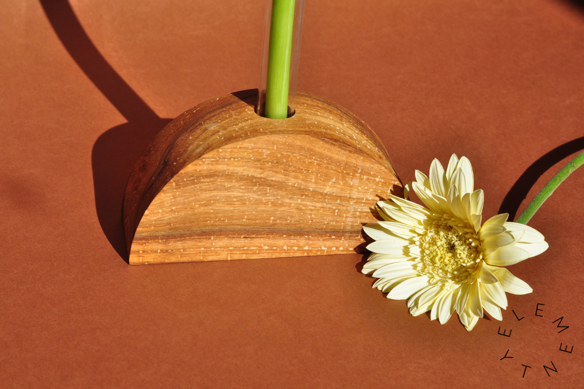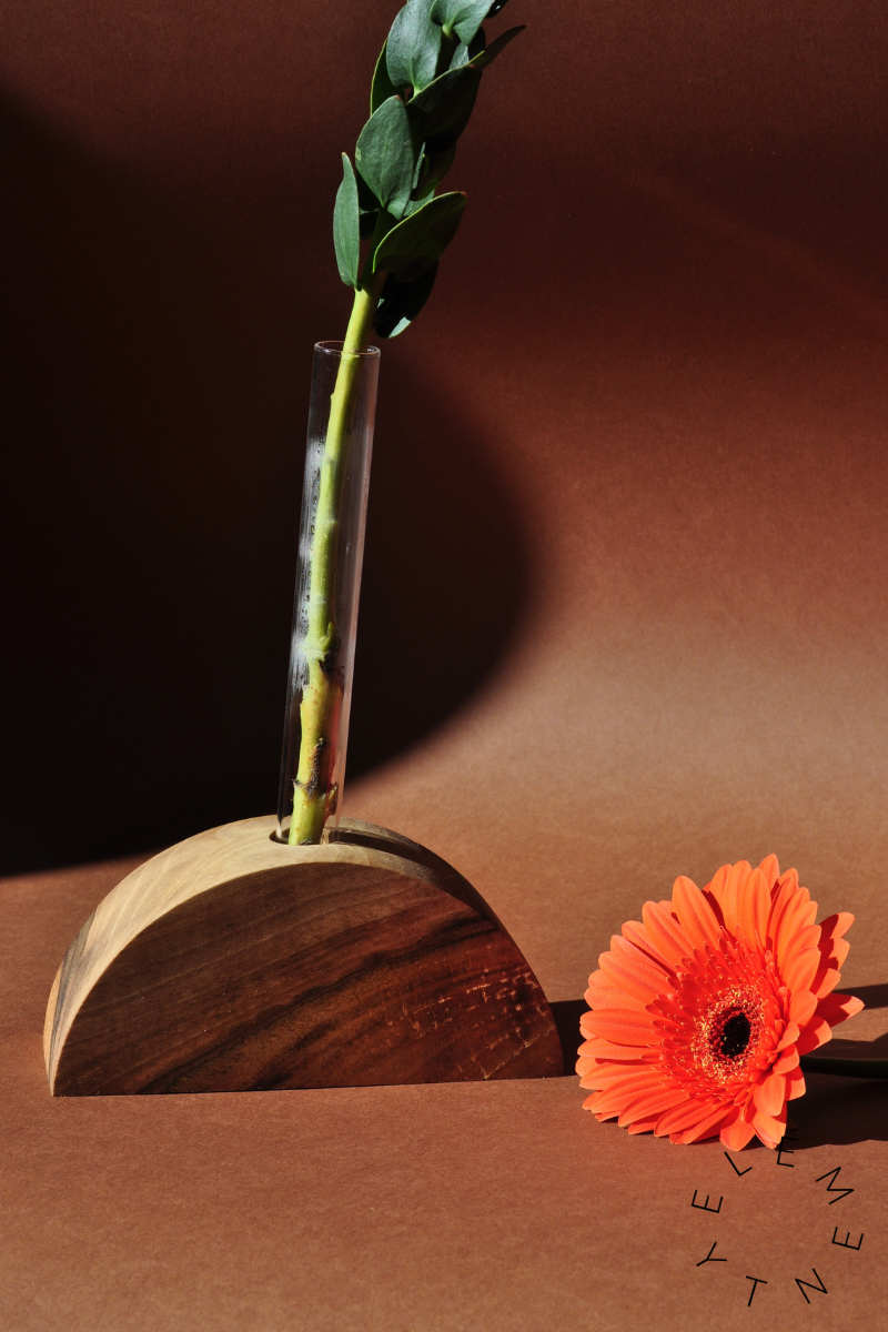 Drewniany wazon na jednego kwiatka lub kompozycję mniejszych roślinek, jak suszone trawy. Nasze wazoniki są wyjątkową dekoracją, zachwycającą swoim niebanalnym wyglądem. Przedstawiony produkt, to szklana fiolka umieszczona w drewnianej półkolistej podstawce, co zapewnia jej stabilność. Nasze naturalne wazony wykonane są z połączenia litego drewna orzecha włoskiego i szkła. Drewniane elementy ocieplą Wasze wnętrza, a niecodzienna forma wprowadzi powiew nowoczesności. Taki drobiazg, to również idealny pomysł na prezent. Każda sztuka wazonu jest inna, gdyż nie istnieją dwa bliźniacze kawałki drewna. Każdy flakon charakteryzuje się nieco innym odcieniem i ułożeniem słojów. Nasz produkt jest funkcjonalny i dekoracyjny. Dzięki swojej prostej, geometrycznej formie, będzie pasować do wnętrz w różnych stylach, dodając im szyku. Odnajdzie się we wnętrzach boho, rustykalnych, japandi czy loftach.