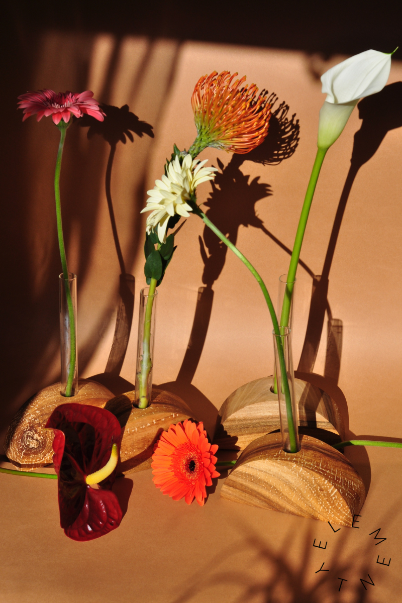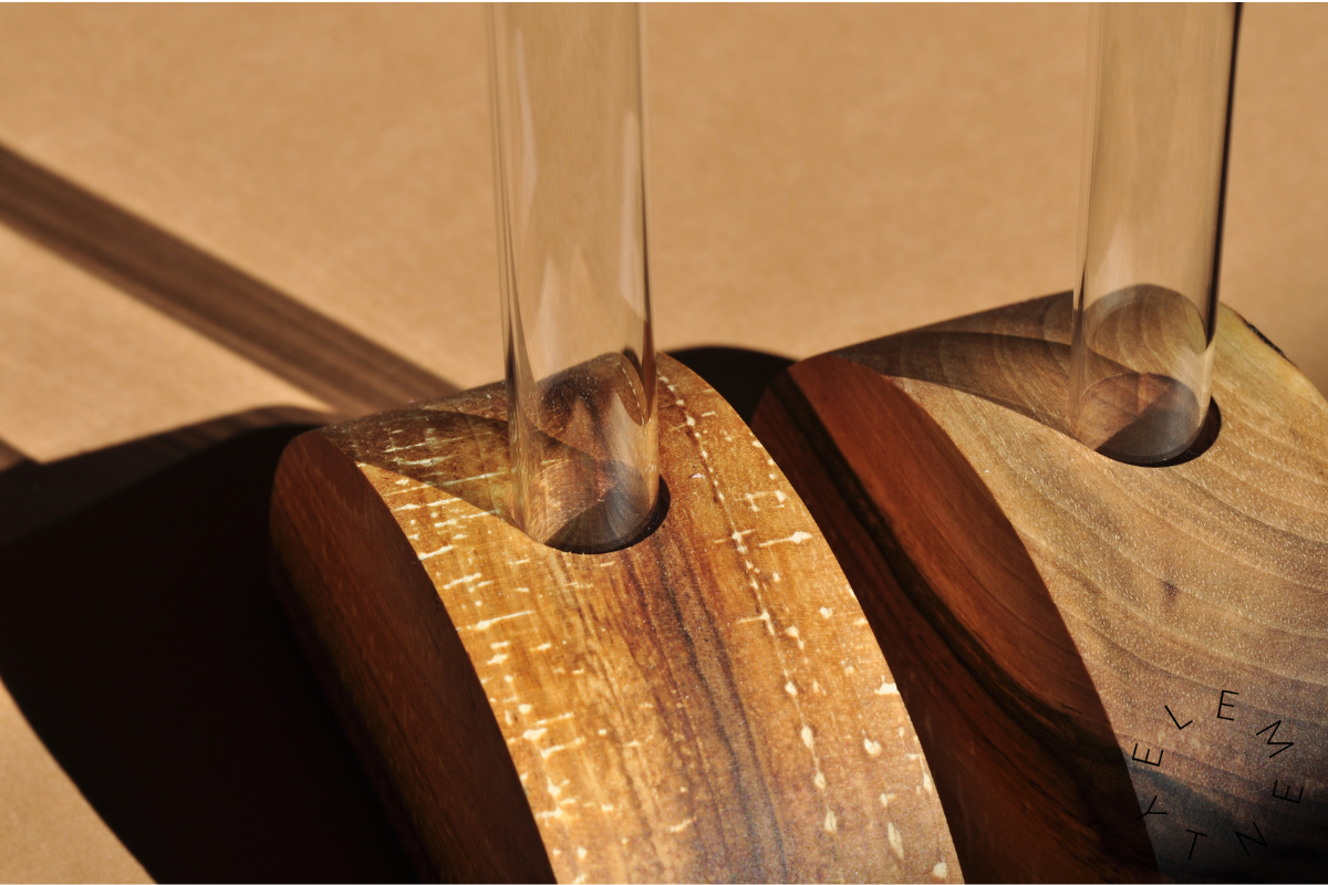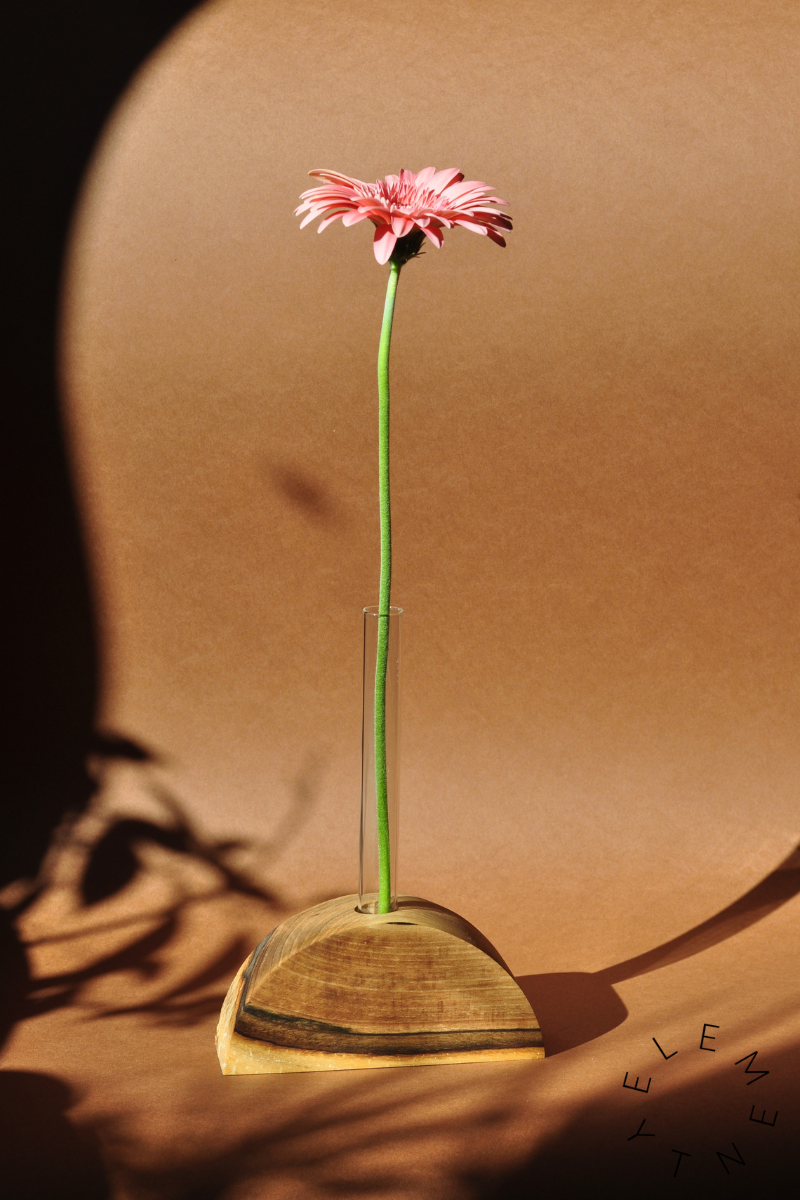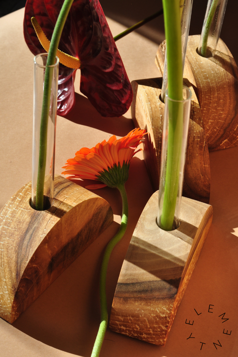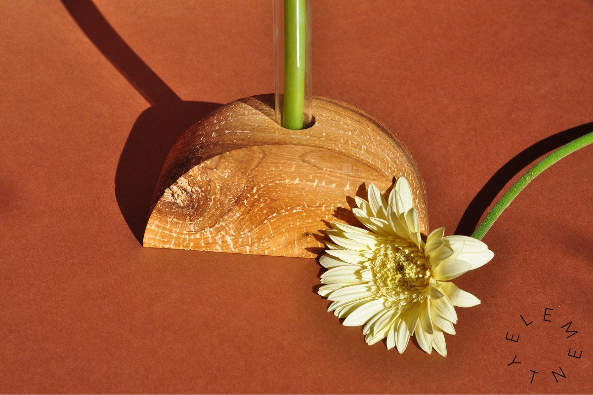 Drewniany wazon na jednego kwiatka lub kompozycję mniejszych roślinek, jak suszone trawy. Nasze wazoniki są wyjątkową dekoracją, zachwycającą swoim niebanalnym wyglądem. Przedstawiony produkt, to szklana fiolka umieszczona w drewnianej półkolistej podstawce, co zapewnia jej stabilność. Nasze naturalne wazony wykonane są z połączenia litego drewna orzecha włoskiego i szkła. Drewniane elementy ocieplą Wasze wnętrza, a niecodzienna forma wprowadzi powiew nowoczesności. Taki drobiazg, to również idealny pomysł na prezent. Każda sztuka wazonu jest inna, gdyż nie istnieją dwa bliźniacze kawałki drewna. Każdy flakon charakteryzuje się nieco innym odcieniem i ułożeniem słojów. Nasz produkt jest funkcjonalny i dekoracyjny. Dzięki swojej prostej, geometrycznej formie, będzie pasować do wnętrz w różnych stylach, dodając im szyku. Odnajdzie się we wnętrzach boho, rustykalnych, japandi czy loftach.